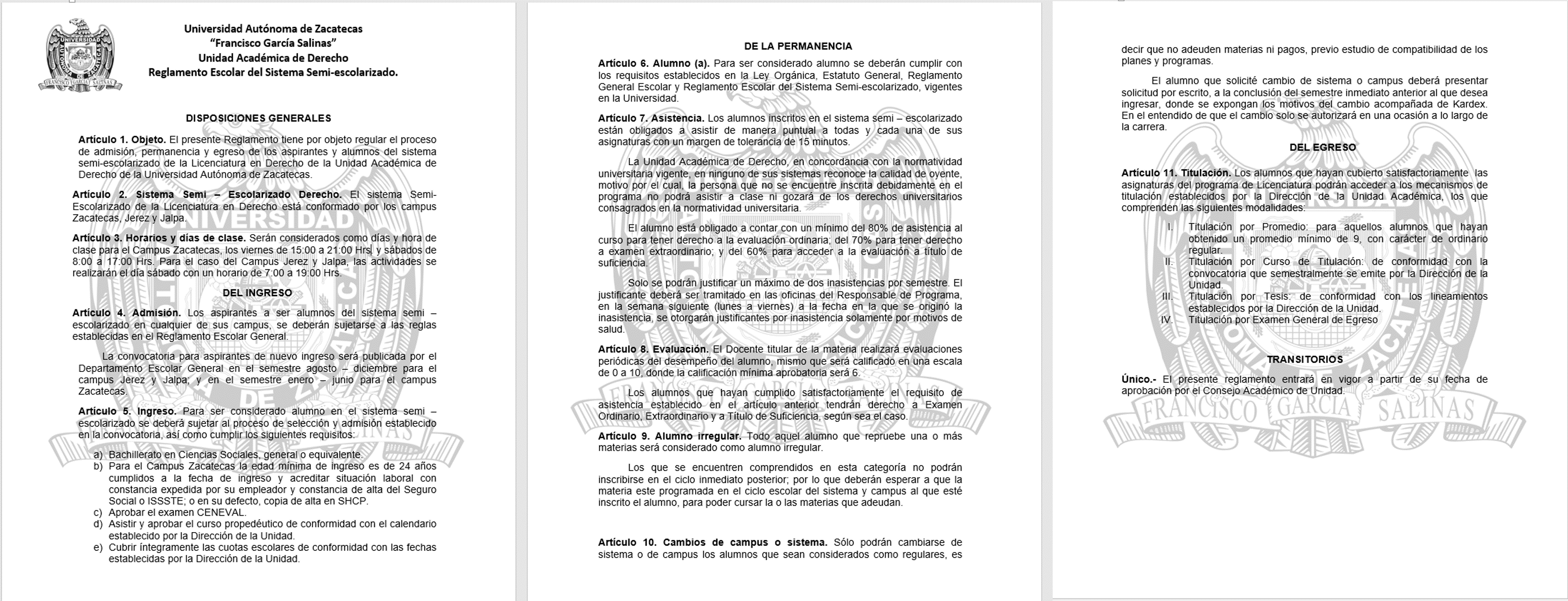 Estatuto GeneralLey Orgánica de la Universidad Autónoma de ZacatecasReglamento AcadémicoReglamento Escolar GeneralReglamento General Sistema SemiescolarizadoLineamientos de Educación Continua